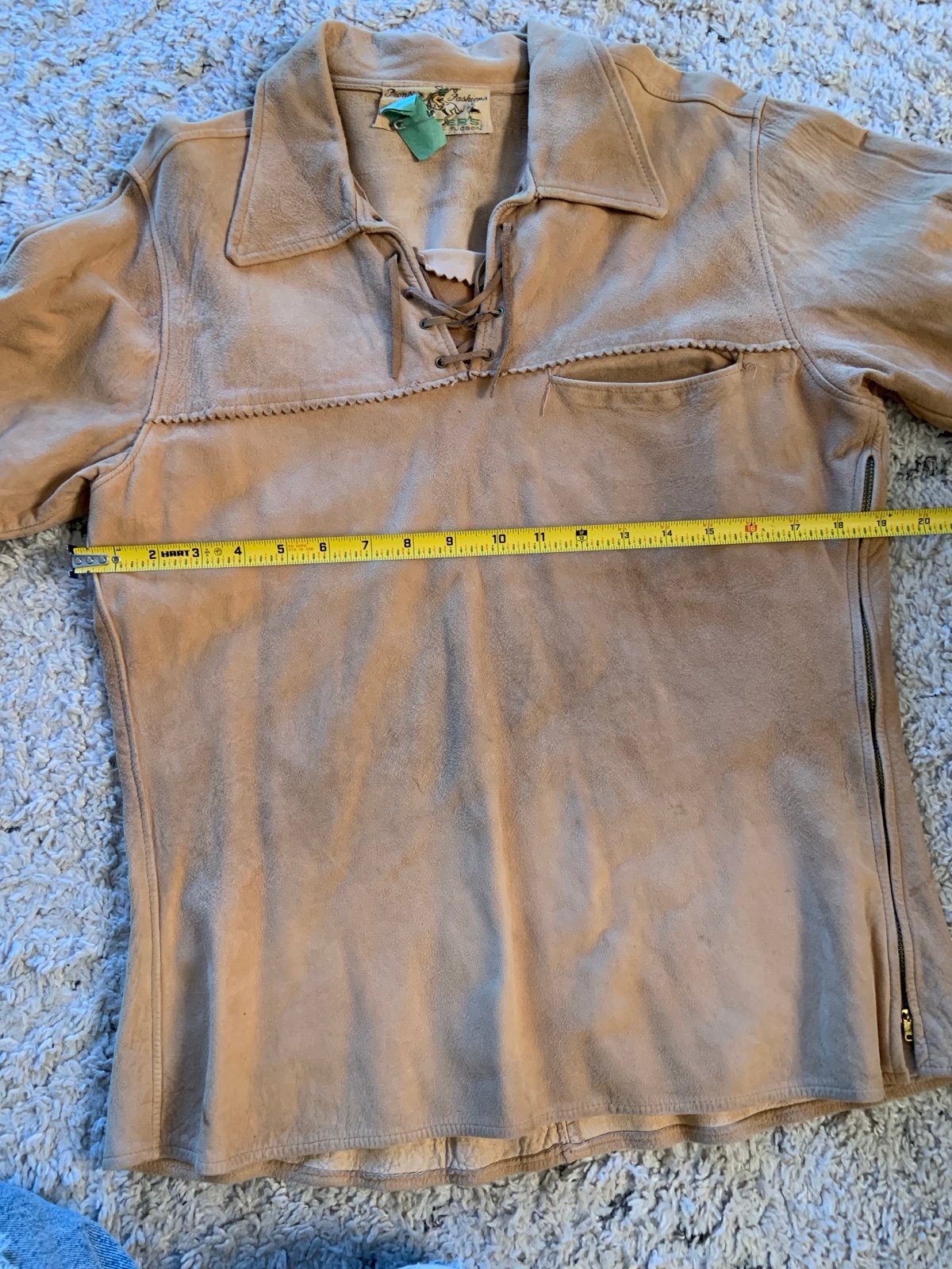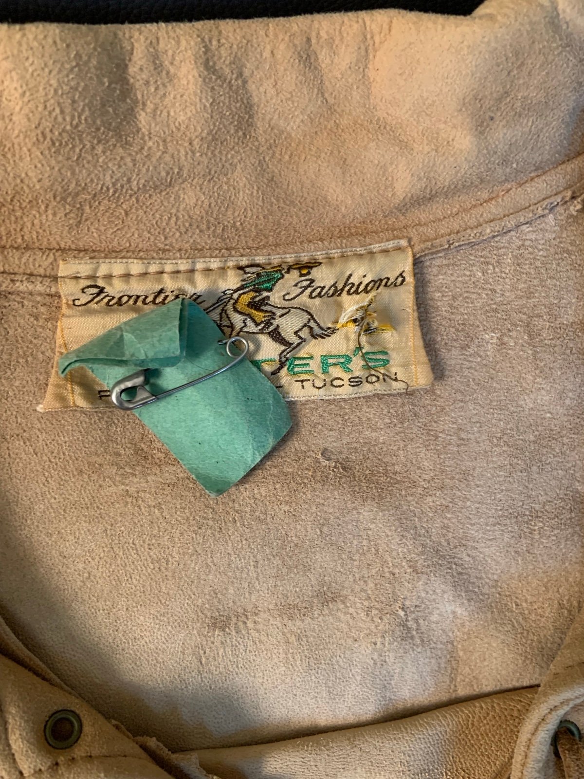 Buckskin pearl snap shirt, size small I believe. Some small flaws, as shown in pics, stitching coming apart in the back a little (can be easily fixed). #vintage #buckskin super soft. Smoke free home. #medieval #cowgirl #cowboy