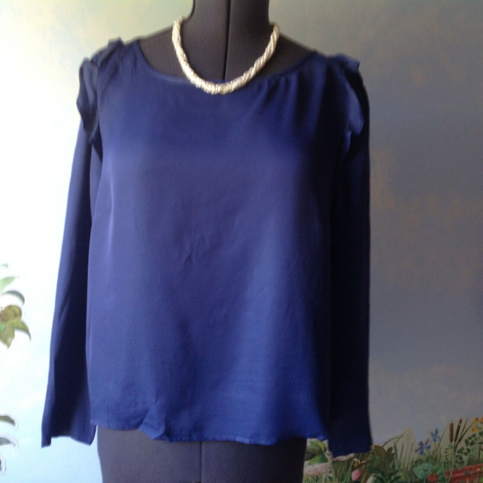 This top is solid in pattern and has long sleeves with frill shoulders, adding a touch of elegance to any outfit. It is brand new and has not been modified or vintage. The color is a beautiful shade of blue that will complement any wardrobe. This blouse is a must-have for any fashion-forward woman.